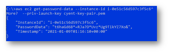 aws ec2 get-password-data --instance-id <InstanceId> --priv-launch-key <your cyent-key-pair.pem>