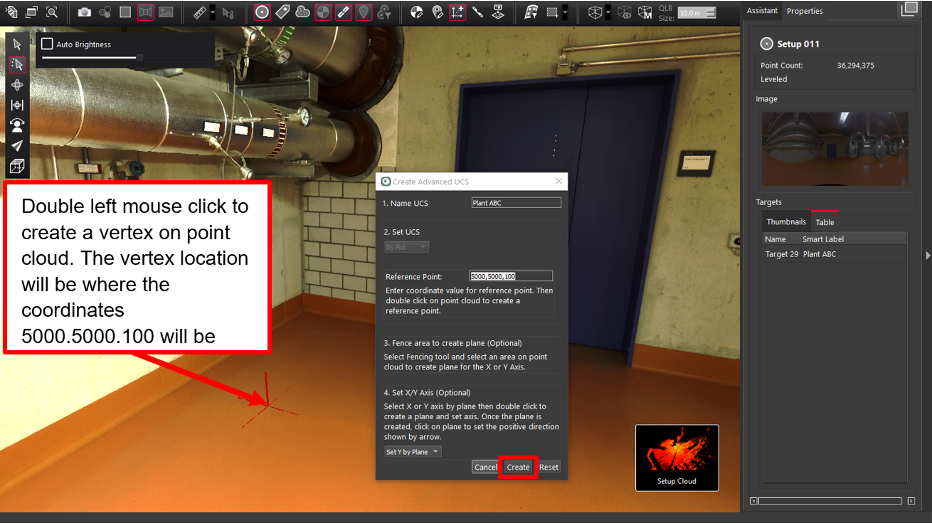 •  At this point the Create button can be clicked and the point cloud’s coordinate system will be set from the vertex (5000,5000,100):