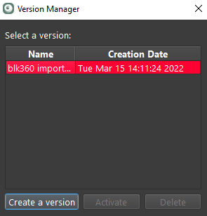 The Versioning in Cyclone REGISTER 360 was designed to provide a valuable tool to keep track of the progression of a registration. While the creation of a Version is fast, not all the changes are saved because saving changes, on large objects such as Point clouds and tone maps (HDR editing), would make each Version very large and would significantly increase Version creation time.
