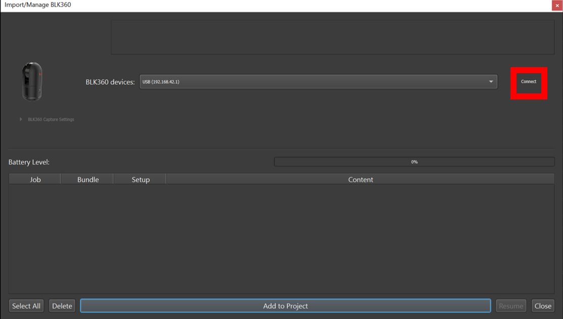 Select the BLK360 Option to open the connection dialog:
