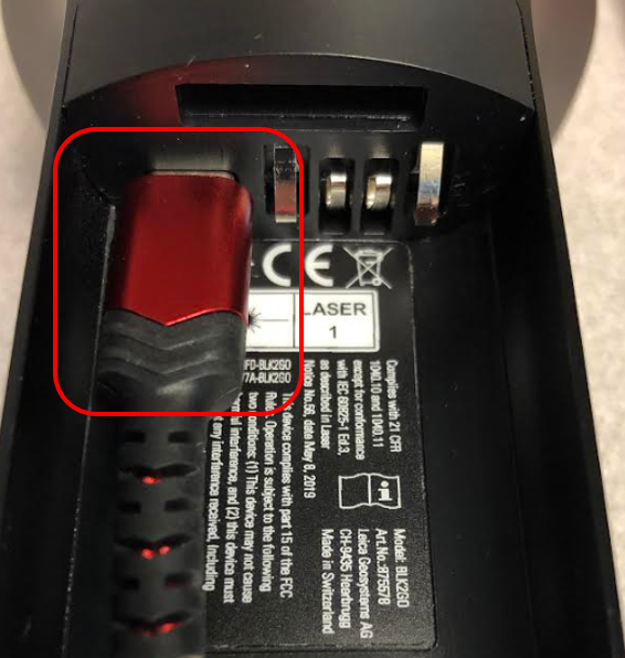Connect the included cable (USB A to USB C, with a 3 rating) to the scanner. The connection is in the battery compartment of scanner: