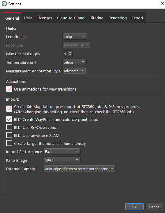 The option to use this new algorithm can be enabled under Settings → General → Import, before the data import. If the option is enabled, it will be applied for any BLK2GO and BLK ARC scans. This has an impact on the processing time, which will be extended. Depending on the scan, processing time may result up to 20-25% more than the time needed if the option is off. Select this option when data has been acquired following the recommendations mentioned above.
