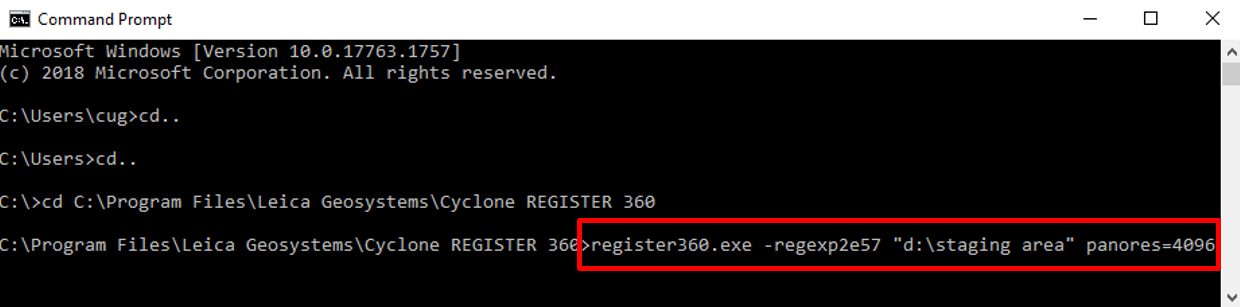 Through a CMD window, the user identifies a staging folder on the computer where the data is located. Then the user enters a command in the CMD window to start the registration process. Cyclone REGISTER 360 will use either VIS links or Cyclone FIELD 360 links to import and register the data.