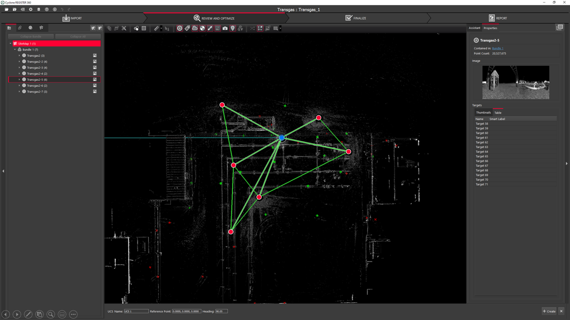 Toggle Create UCS. A graphic circle will appear over the setup with a heading line that shows the current heading. The coordinate value in the action bar can be changed to user specified values (i.e. 5000,5000,100). The coordinate value is initially the center of the selected setup (0,0,0) or scanner origin. You can drag the coordinate location to another location and also change the heading of the coordinate system by rotating the heading graphic along a wall for example. Even if the graphic circle is moved from the the setup the setup selected in the beginning is still the home setup.