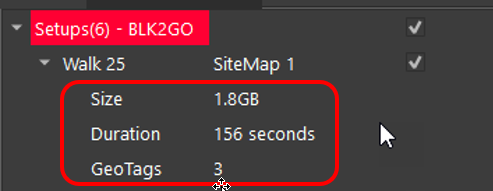 Listed under each Walk is the size of scan, duration and the number of GeoTags.