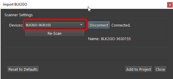 Connect to the wireless network of the BLK2GO scanner. SSID and PW are listed in the battery compartment of the scanner.