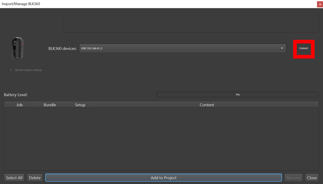 Select the BLK360 Option to open the connection dialog: