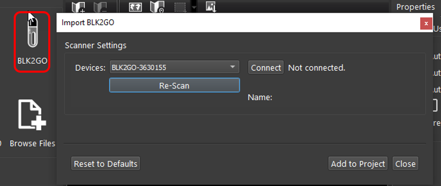 Connect to the wireless network of the BLK2GO scanner. SSID and PW are listed in the battery compartment of the scanner.
