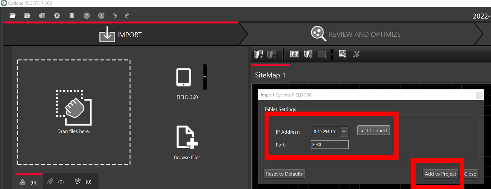 Check the IP Address and Port from the tablet and select Test Connect and Add to Project.