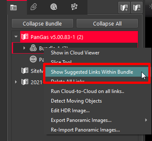 In SiteMap view select a bundle or setup and move it within proximity to another bundle or setup. Up to 5,000 suggested links will appear. Select a suggested link (dotting white line) to bring up the action bar that lists the options to join setups. You can also select an existing link (red, yellow or green) to bring up the action bar to join or re-align the link.