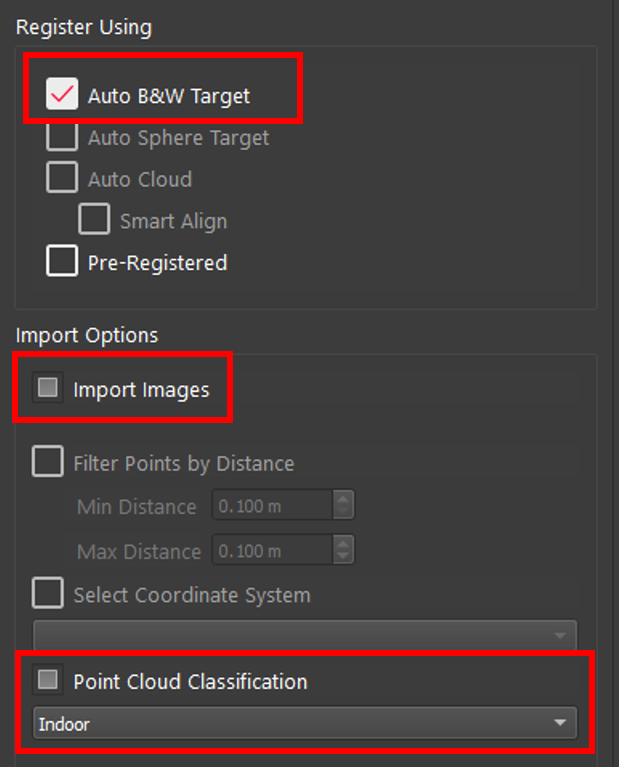 If the object selected is for example a project that has Setups with different settings under it, the check box will turn into a filled-in square. As shown below all Setups have Auto B&W Target selected, but some have Import Images and Point Cloud Classification and none of the Setups have Pre-Registered.
