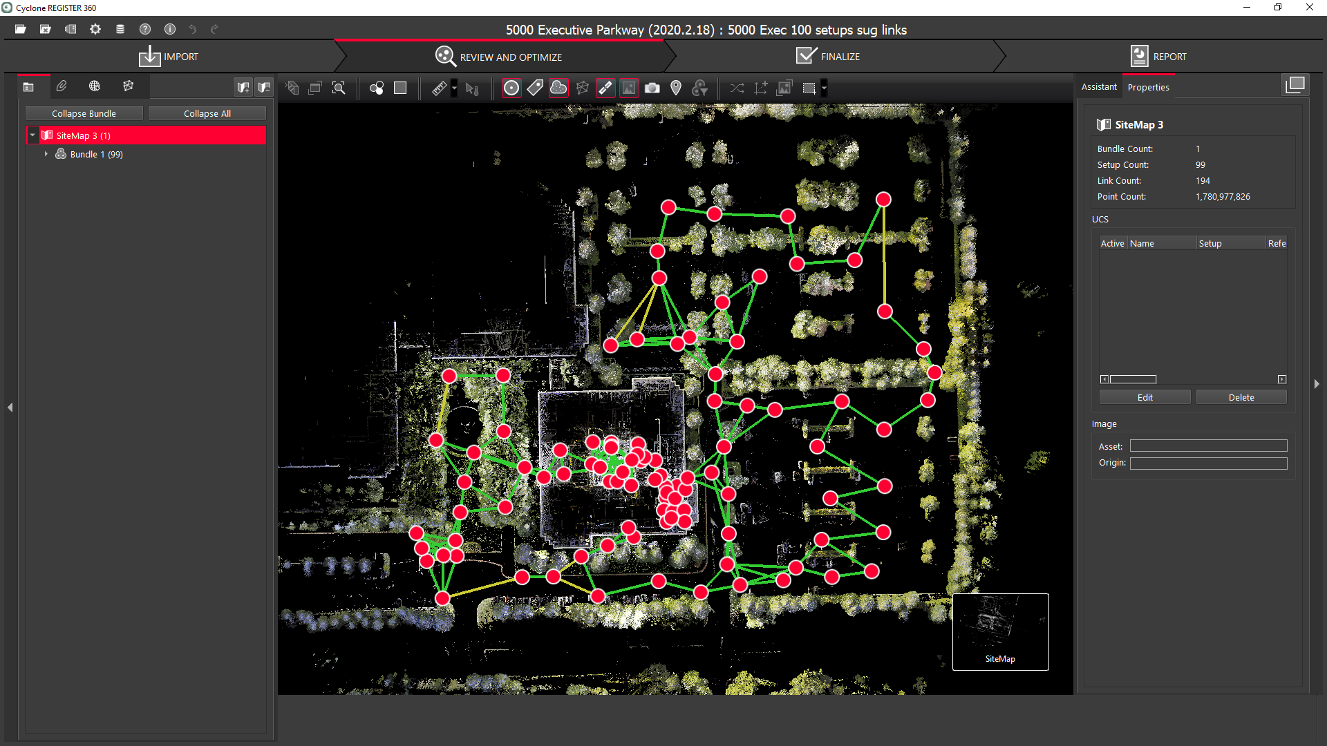 This view of the project is locked in the top down view. Panning and zooming is allowed in this view. The point clouds are rendered with silhouette rendering to help clarify the view. Use Bundle cloud view for full navigation and viewing of all the points in the project.