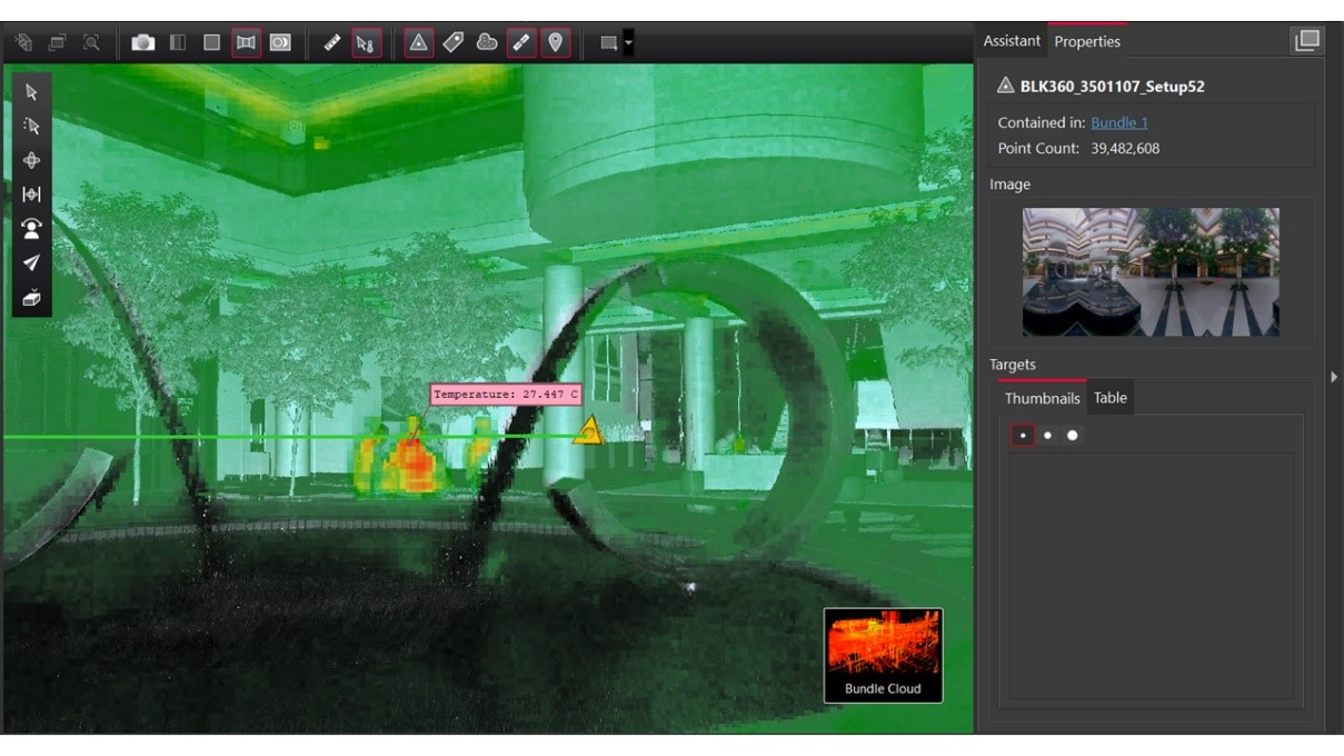 BLK360 G1 IR data is supported, providing users with expanded options for viewing and querying their data. If IR data was captured during scanning, the option to view the IR image is available from the top toolbar. There is also a new command on the top toolbar next to the IR image option to query the temperature of a selected point on the IR image.
