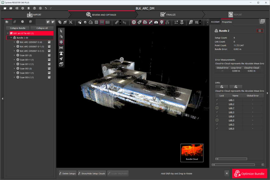 An example of the Bundle Cloud view of BLK ARC data that contains a mix of static and kinematic scans, links, and GeoTags imported to Cyclone REGISTER 360 PLUS
