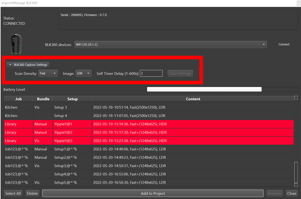Users may also set the options for future scans by selecting BLK360 Capture Settings.