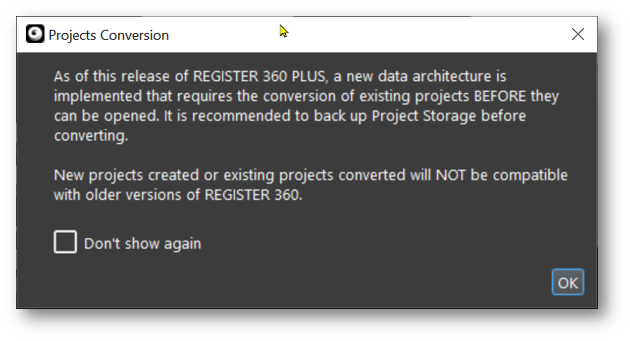 A free project converter tool, named REGISTER 360+ Converter, is also available that can convert projects without using a license. This tool is located in the Project & Storage dialog, where single or batch project conversion can be done using the shortcut below.