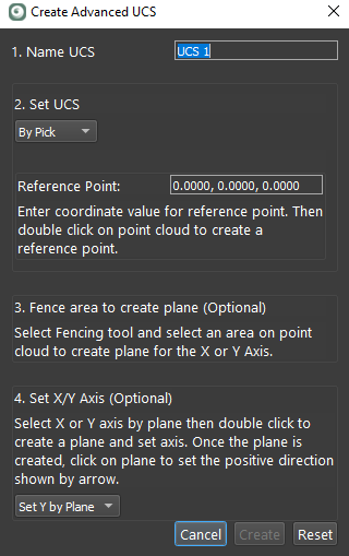 The Create Advanced UCS dialog will appear. Through this dialog, the user is guided through the UCS creation process to ensure that they achieve optimum results.
