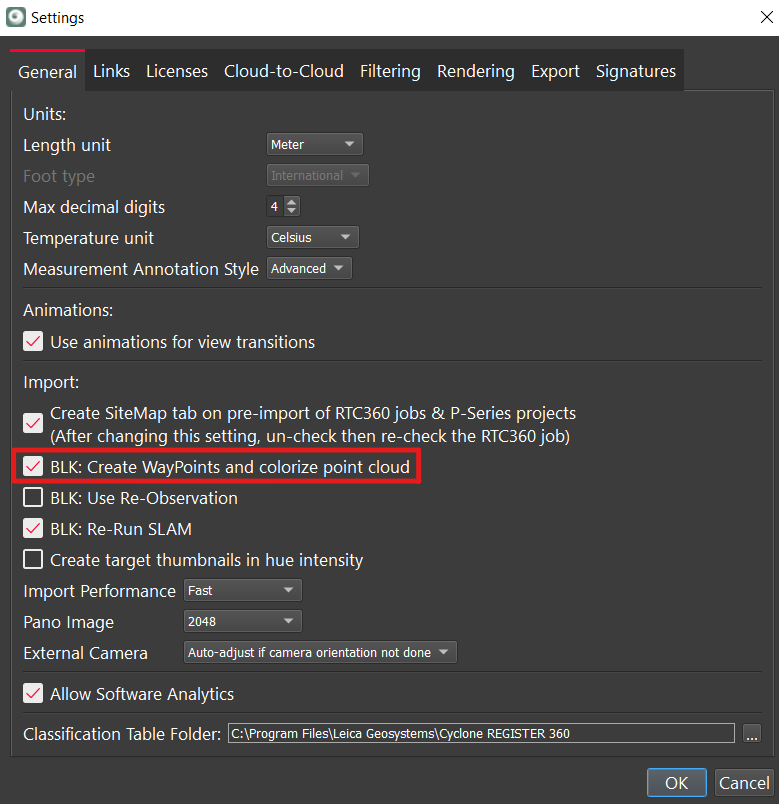 Note: To save time importing BLK data, there is an option to import the data without colorizing the data or creating WayPoints that contain panos. To use this setting, go to Settings, and under the General tab, deselect the BLK: Create WayPoints and colorize point cloud check box.