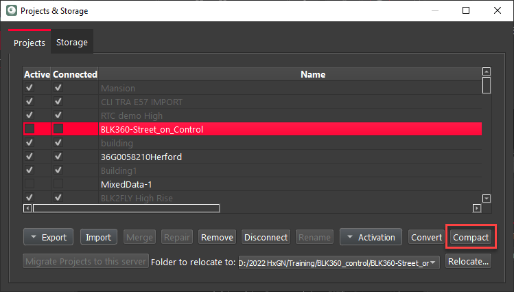 To help mitigate certain data loss issues, REGISTER 360 has been changed to no longer allow full deletion of Setups, WayPoints, and Assets. While this may prevent further data loss issues the Project Storage folder will not show reduced file size when Setups or Assets are deleted. Objects deleted are marked in the database for deletion and only permanently deleted when the new Compact feature is used. It is located in the Project & Storage area: