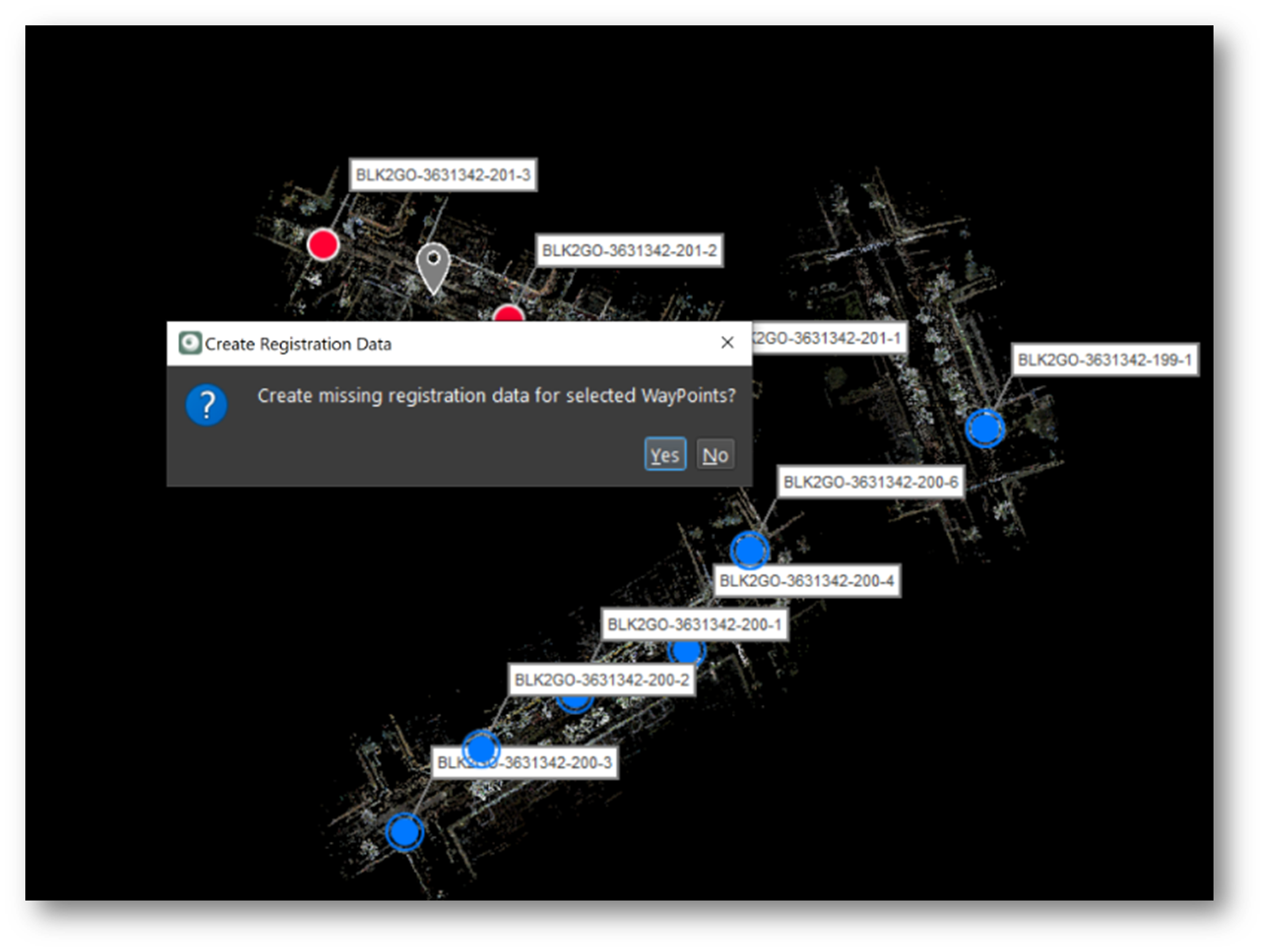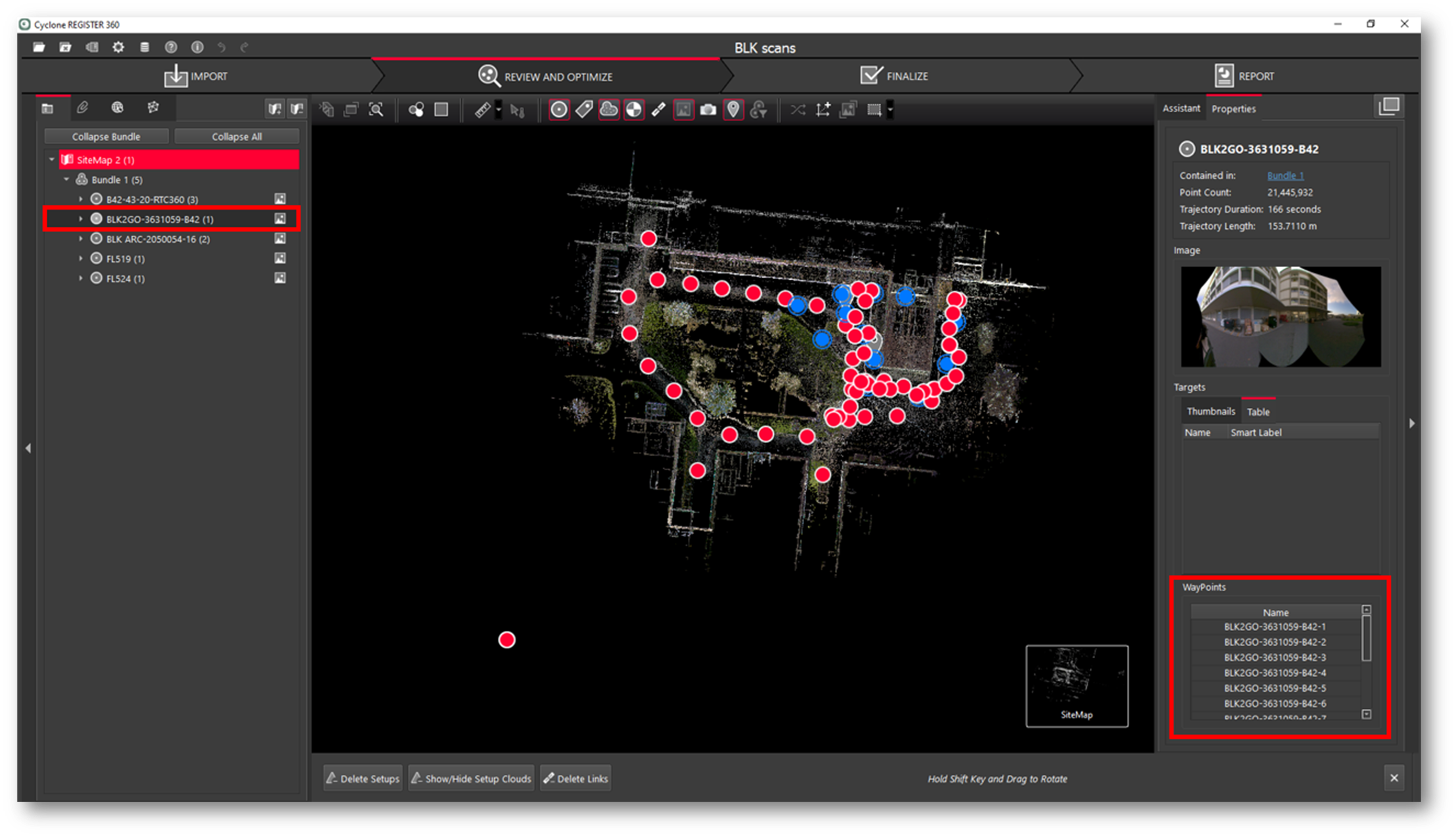 Upon import, Cyclone REGISTER 360 PLUS will import the point cloud data and pano images per-user setting. The user can set the WayPoint creation every 1-meter or more, along the trajectory. It is not necessary to create WayPoints to import BLK2GO PULSE data, but at least one WayPoint must be created to import the data with at least one handle or WayPoint to move and rotate the data in the SiteMap area.