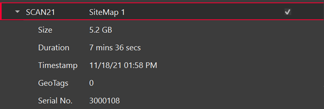 Note: Listed under each Scan are its data size, duration, time stamp, and the number of GeoTags (not supported for BLK2FLY scans) it contains.