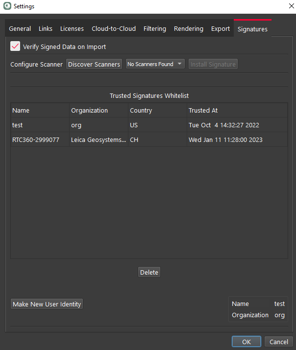 The User Identity is separate from the Scanner Identity in the Verification Report. This allows different User Logins to have different Trusted Signatures Whitelists. Under Settings, go to the Signature tab. Select Make a New User Identity on the bottom left. Note that on the bottom right, it shows the current User Identity.