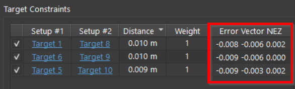 Error vectors are displayed for target-to-target registrations, showing the slope distance and error vector between targets. Error vectors are listed in the Target Constraints table within Link Properties, offering detailed metrics on the slope and the combined average of Cloud-to-Cloud constraints.