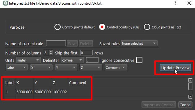 Select the desired formatting for each column (i.e. Label, X, Y, Z, and Comment):