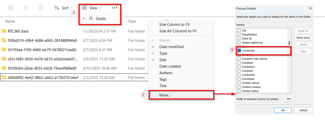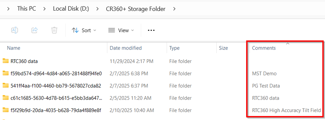 Users can easily identify project folders located in the Storage folder by project names using the Comments column in Windows Explorer. This feature is available only for connected projects. When reconnecting to a project that was not previously connected, simply close and reopen Cyclone REGISTER 360 PLUS and refresh the Comments column in Windows Explorer.