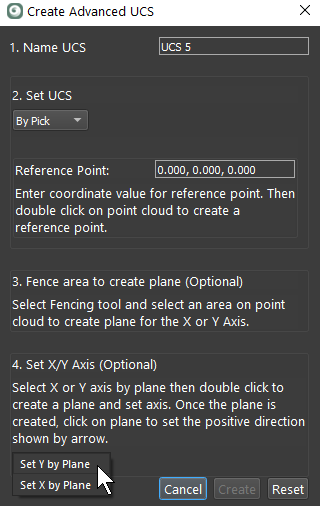 By Pick will allow the location of a pick point on the point cloud to adopt the coordinate set by the user, then optionally, the user can create a plane to set the X or Y axis.