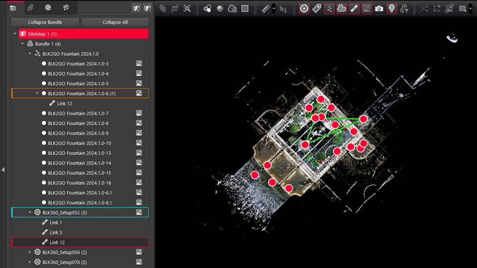 If a Link is formed from a WayPoint to other clouds (to a WayPoint or a Setup), the Link will be added under the WayPoint object. This facilitates the creation of Links that include both structured and unstructured data. Links between WayPoints from mobile data to other point cloud data are represented in the panel. This enables easier interaction with these Links and Bundles, similar to the interaction with Setups and Bundles, enhancing the overall user experience.