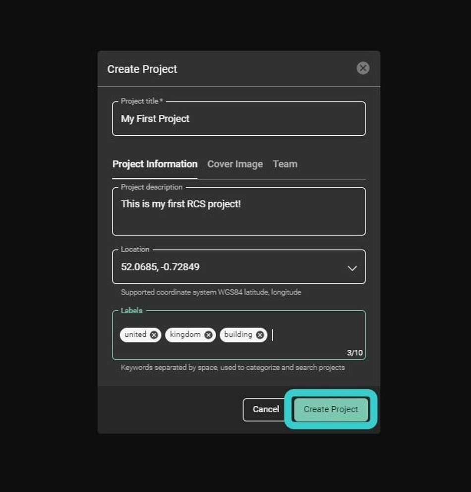 프로젝트 생성 버튼을 클릭하면 작은 대화 상자가 나타나 프로젝트 이름과 프로젝트 설명을 생성하고, 프로젝트 위치를 추가하며, Reality Cloud Studio 전반에 걸쳐 다양한 유형의 프로젝트를 추적할 수 있는 라벨을 추가할 수 있습니다.