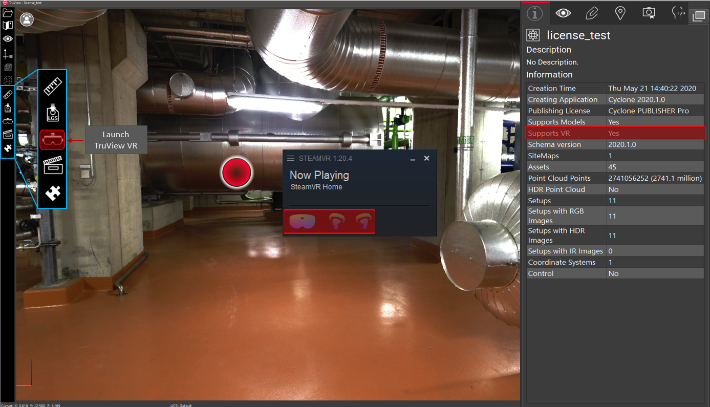 TruView VR can be launched directly from TruView. Prior to launching TruView VR, open the Info panel and ensure that it is supported with your project. Ensure that the headset that you are using is properly connected and that the associated controller are paired. At this point you can click on the Launch TruView VR button on the main toolbar and put on the headset.
