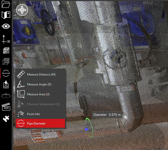 Mouse Control: In Measure Diameter mode, single left click on a cylindrical pipe in the point cloud.