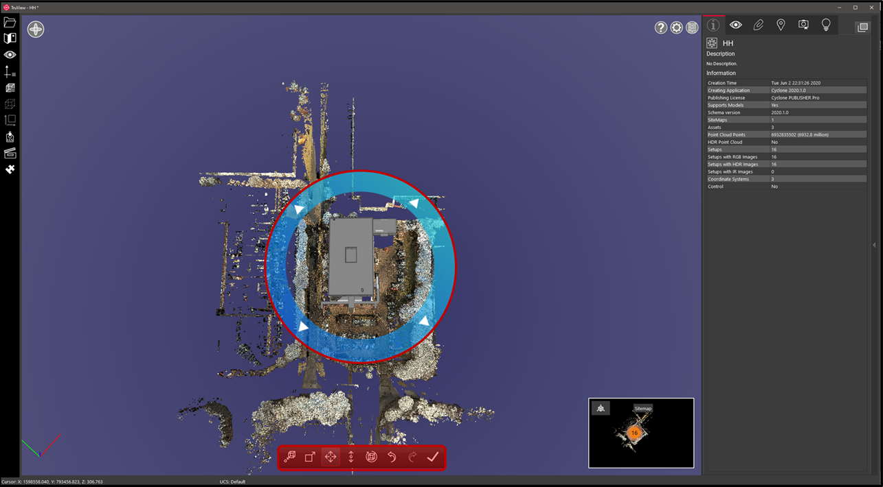 If necessary, make additional adjustments to align your model. After initial loading, the model will be in editing mode automatically. If you have exited this mode, double click on your model to enter model editing mode again. A blue ring will appear around the model to show its extents and the model editing toolbar will appear at the bottom of the viewing window.