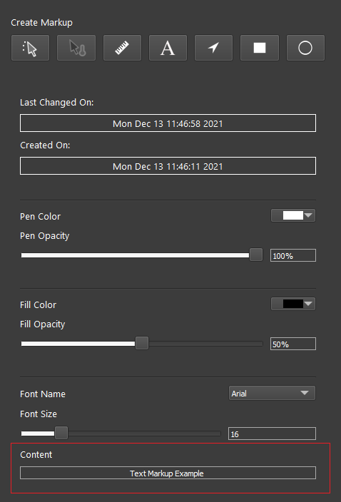 Options to edit the Markup will be active based upon the tool selected. Once inserted, the Markup will only exist in the Snapshot that was selected at the time it was inserted. Once inserted, the color, opacity and size of the markup can be adjusted in the lower section of the pane. If the Markup contains a measurement the unit can be changed. If the Markup contains text, the font type can be changed.