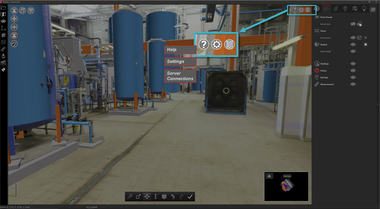 Viewer settings, help and the connection manager are located in the top right-hand side of the main viewing window. Available settings include: