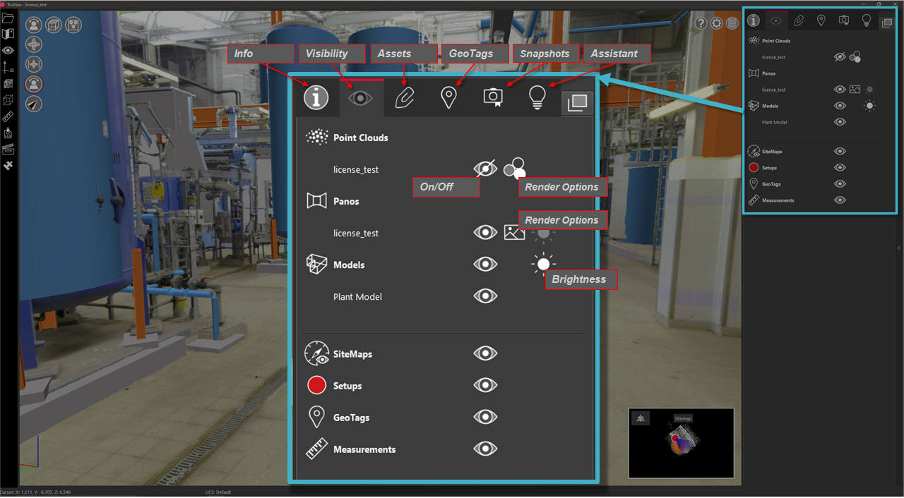 TruView includes a collection of Panels on the right-hand side of the application which include different information and functions of the program. These include: